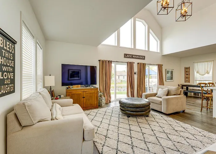 La villa Sleek Getaway On Lake Wawasee With Private Dock! también dispone de una cocina completa equipada con un lavaplatos, una nevera y un horno para la comodidad de los huéspedes. El aeropuerto más cercano a la villa Sleek Getaway On Lake Wawasee With Private Dock! es regional de South Bend, ubicado a 85 km.